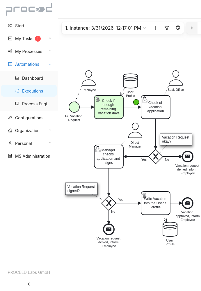 PROCEED acts as the deterministic “brain” behind AI assistants by translating natural language into structured, executable business processes. When an employee interacts with an AI agent, PROCEED ensures that every request is mapped to a clearly defined process with rules, logic, and constraints. This allows AI to move beyond simple responses and actually perform real business operations in a controlled and reliable way. At the same time, PROCEED enforces company policies, manages approvals, and guarantees full traceability of every action. In this way, it bridges the gap between flexible AI interaction and the strict requirements of enterprise systems.