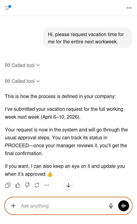 From vacation requests to complex operations: Employees just ask. PROCEED handles the logic.